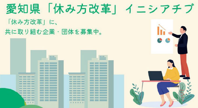 愛知県では、「休み方改革」を通じ、ワーク・ライフ・バランスの充実と生産性向上による地域経済の活性化を目指す運動に取り組んでいます。この「休み方改革」につながる取組の一つとして、「ワーケーション、ブレジャーの促進」を掲げ、 県民及び県内企業・団体に働きかけることでワーケーションの普及啓発を図っています。
