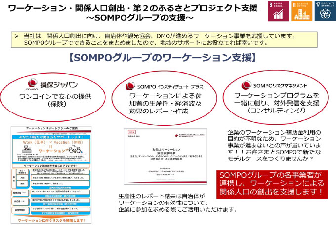 パートナー企業と連携し、全国町村会(都道府県)OB向けにSOMPOグループで行ったワーケーションの実証実験の結果に基づき、ワーケーションの効果やワーケーションを活用した地方創生の取組事例について講演を実施。 ワーケーションの為に開発したSOMPOグループのソリューションを活用し、全国の自治体と連携し、ワーケーションの普及の下支えをします!